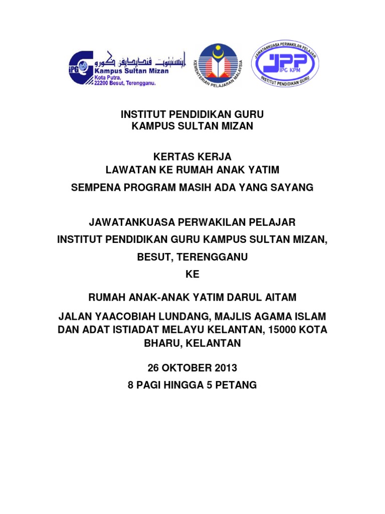 Ziarah An-Nur 14 Hingga 16 Mac 20141435H Berat Sama Dipikul Ringan Sama Di Jinjing ----- Dengan Nama Allah Yang Maha Pemurah Lagi Maha Mengasihani ZIARAH AN-NUR LAWATAN KE RUMAH BADAN USAHA DIDIKAN ANAK YATIM DIBAWAH PERTUBUHAN KEBAJIKAN ANAK YATIM PERLIS 20141435H TARIKH 14 HINGGA. Tujuan kertas kerja ini diadakan adalah untuk memaklumkan mengenai usaha untuk membesarkan ruang solat di bangunan Surau Al-Khairiah Maktab Rendah Sains MARA Pengkalan Chepa. Biro Kebajikan Sosial dan Kebudayaan.