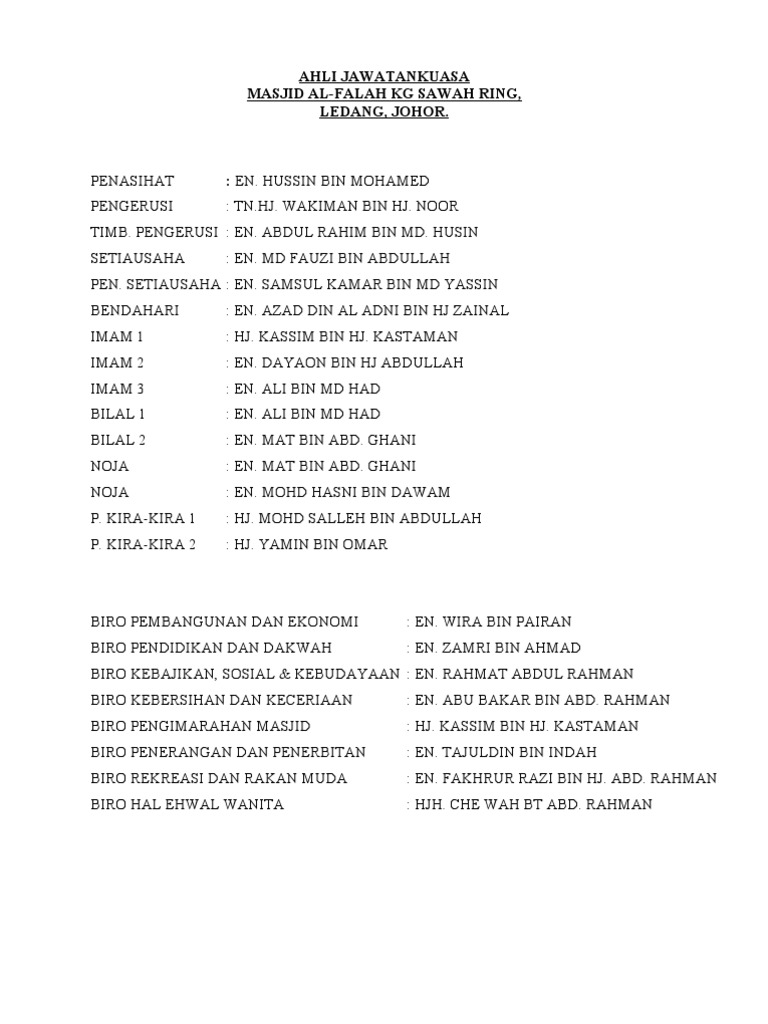 Biro Keselamatan dan Sukarelawan. Berikut adalah tanggungjawab dan senarai tugas setiap biro. Minit mesyuarat Pertama jawatankuasa pembinaan surau.